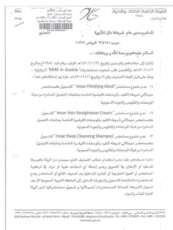 له أثار سلبية مثل الالتهاب الشديد لجلد الرأس وأي جلد يلامسه المنتج وكذلك حرقة شديدة بالعين ملف مرفق 5408 كما أنه ليس مرخصا من قبل هيئة الغذاء و الدواء كما يوضح هذا الخطاب: ملف مرفق 5409 لذا وجب التنبيه. |