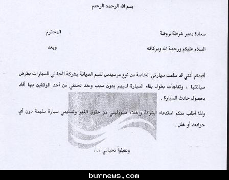 بتاريخ 01/05/1431هـ أدخلت سيارتي من نوع مرسيدس الى ورشة الصيانة في شركة الجفالي عن طريق مهندس الاستقبال ورقم السير كان (273) وقد أفاد مهندس الاستقبال بان فترة الصيانة للسيارة سوف تستغرق ثلاثة أيام من تاريخ الدخول .