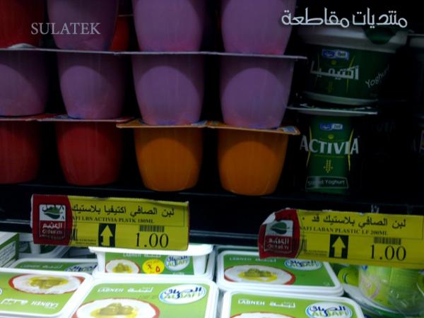 ايضا هنا اللافتة ( لبن الصافي بلاستيك ) السعر ريال واحد