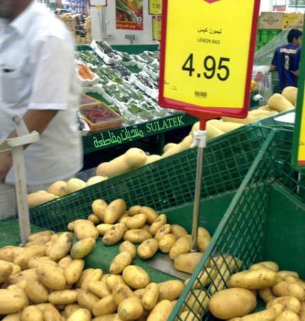 الصورة اعلاه .. فيها ان بعض الأسواق الكبيرة توظف عمالة غير عربية ، وبالتالي فالمثير للدهشة هنا أن تتحول لافتة السعر من بطاطس الى ( ليمون ) وأي ليمون ؟ ليمون بالكيس !!!!!!