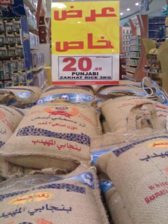 كانت هناك أيضا أكياس بن داود معبأة بوزن الزكاة المطلوب لكني نسيت تصويرها كما أني لا أعرف نوع الأرز المعبأ لكن حسب ما أذكر كانت هناك نوعين .. مصري و أمريكي .. و السعر كان 9.50 ريال للكيس.