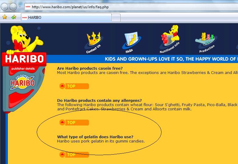 المصيبه الكبيره . اخبرني احد الزملاء انه راى مقال عن استخدام الشركه لجيلاتين الخنزير في صنع هذه الحلويات . انا قلت يا ابن الحلال لا تكبر السالفه اكيد اشاعات . قالي ادخل على موقعهم وشوف بنفسك .