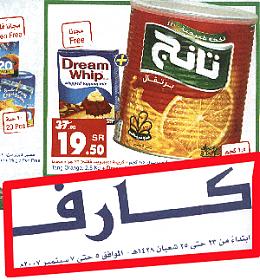 فتحت الباب وحصلت بروشور كارفور وفيه عرض بأن عصير (التانج) بقيمة (19)ريال مع (دريم ويب) هدية ـ رحت في نفس اليوم إلى كارفور وحصلت السعر بـ (26 ريال) وليس كما هو في البروشور ـ طبعا تجادلت مع الكاشير وقلت له أن العرض ساري حتى يوم غد ولكنه قال ما أبيعك غير بسته وعشرين عجبك أو رح اشتكي الإدارة