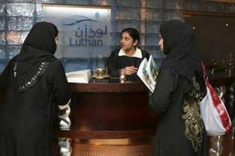 سعوديتان تتناولان طعام الغداء داخل فندق « لوذان» والمخصص للنساء فقط وهو الفندق النسائي الأوحد في العالم والذي افتتح مؤخرا بالعاصمة الرياض. |