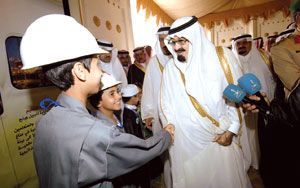 الملك ملمحاً لحضور عرض الجبيل الصناعي: اللهم رخص الحديد خادم الحرمين يصافحالأطفال أثناء استقباله الجبيل: قصي البدران، حمد آل مطير، سعيد الشهراني في رسالة ذات مغزى قال خادم الحرمين الشريفين الملك عبدالله بن عبدالعزيز لدى تدشينه مشاريع الجبيل الصناعية أمس: "بسم الله وعلى بركة الله، اللهم رخص الحديد". واعتبر الحضور كلمات الملك رسالة لخفض أسعار هذه السلعة حتى لا تثقل كاهل المواطنين. ولم تقتصر دلائل الوفاء للوطن والمواطنين على هذه اللفتة حيث حرص خادم الحرمين الشريفين على تكريم ابني وزير المالية الأسبق عبدالله بن سليمان الحمدان - يرحمه الله - عبدالعزيز وأحمد حيث قام بتقليدهما وشاح الملك عبدالعزيز من الدرجة الأولى. يذكر أن تاريخ الوزير الراحل يحتفظ له بالمشاركة في التنقيب عن النفط عام 1933. وكان خادم الحرمين الشريفين قد استهل جولته أمس والتي دشن وأسس خلالها 29 مشروعاً تنموياً وصناعياً للهيئة الملكية للجبيل وينبع وشركة سابك وشركات قطاع الأعمال باستثمارات تتجاوز 68 مليار ريال، بتفقد معرض يتضمن تقنيات التعليم الإلكتروني ومنتجات شركة سابك للبلاستيك المبتكر. |