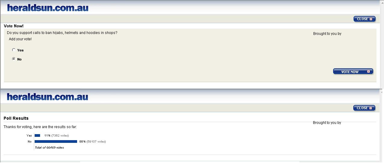 تقوم صحيفة هيرالد صن الان بعمل استفتاء حول منع الحجاب في المحلات التجارية باستراليا إذا كنت غيورا على دينك وعلى محارمك فساهم قبل نهاية التصويت بالمشاركة وارسال الرساله للاصدقاء اختر No فقط اضغط على الرابط ادناه http://www.news.com.au/heraldsun/pol...037790,00.html نتيجة التصويت حتى الآن.. |