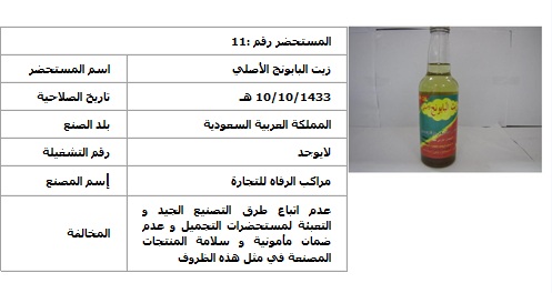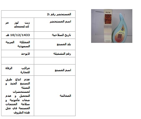 الهيئة العامة للغذاء والدواء في السعودية في إطار الدور الرقابي للهيئة العامة للغذاء والدواء للتحقق من سلامة ومأمونية مستحضرات التجميل ، وبالتعاون مع الجهات المختصة تم الوقوف على مصنع غير مرخص باسم ( مراكب الرفاه للتجارة ) يقوم بتعبئة عدد 18 من مستحضرات التجميل تشمل بعض أنواع الزيوت المستخدمة للشعر ومزيلات العرق والبخور في منطقة سكنية دون إتباع طرق التعبئة والتصنيع الجيد لمستحضرات التجميل والمنصوص عليها في المواصفة القياسية السعودية الصادرة في هذا الشأن ، وقد قامت الهيئة بمخاطبة الجهات المعنية لاتخاذ الإجراءات النظامية اللازمة لسحب هذه المستحضرات الموضحة في الجدول المرفق . وتنصح الهيئة المستهلك بعدم استخدام مستحضرات ( مراكب الرفاه للتجارة ) والموضح أسمائها وصورها على موقع الهيئة والتخلص مما لديهم من عينات ، كما تنصح المستهلك بالتأكد من وجود المعلومات الكافية على منتجات التجميل كاسم المصنع وعنوانه والمحتوى ورقم التشغيلة وتاريخ الإنتاج. وستواصل الهيئة رسالتها التوعية من خلال الإعلان عن أي منتجات مضرة لصحة المستهلك . مراكب الرفاه للتجارة 1 زيت المرمرية للشعر marmariah hair oil 2 زيت لوز مر almond oil 3 زيت خروع body oil 4 زيت جلسرين ( البارفين ) 5 زيت الخس الأصلي 6 البخور الدوسري 7 زيت الجرجير الأصلي 8 زيت خروع أصلي للشعر 9 زيت البصل الأصلي للشعر 10 زيت السدر الاصلي للشعر 11 زيت البابونج الأصلي للشعر والجسم 12 زيت لوز حلو للشعر 13 الزيوت السبعة للشعر 14 زيت الحبة السوداء الأصلي للشعر والجسم 15 زيت خردل أصلي للشعر 16 مزيل العرق ( الرفاه ) 17 زعفران إيراني أبو شيبه ماركة الرفاه 18 زيت النخاع التونسي للشعر المصدر http://www.salamaty.com/news-action-show-id-202.htm |