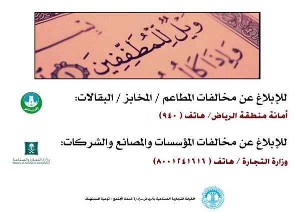 كيف أبلغ عن مطعم مخالف ... أو عن مخبز مخالف ... أو عن بقالة مخالفة ... أو عن شركة خالفت في منتجاتها ... أو مصنع غش في منتجة ... أو غير ذلك ... فمع حملة " ويل للمطففين " التي أطلقتها الغرفة التجارية بالرياض أوضحت لكم الطريقة عبر بروشور حملتها : http://s.alriyadh.com/2013/03/19/img/038144918624.jpg و للمقيمين خارج مدينة الرياض تستبدل أمانة الرياض بأمانة المنطقة التابعه لها ... أو برقم البلدية أو البلدية الفرعية المتواجده في مدينتك . |