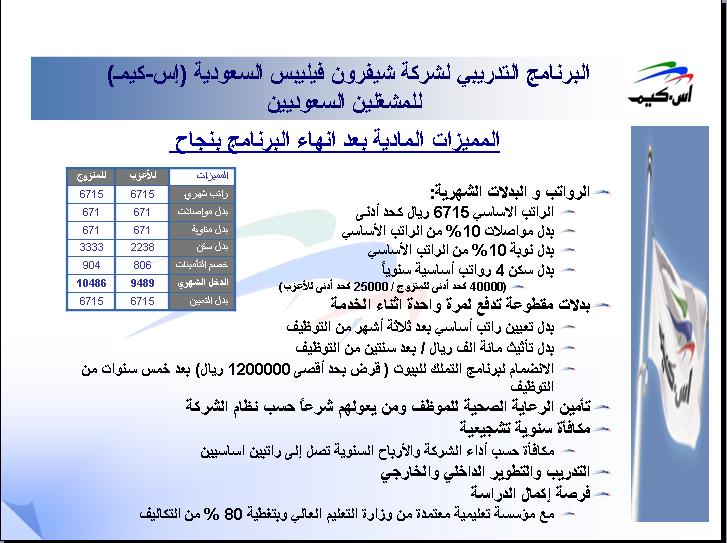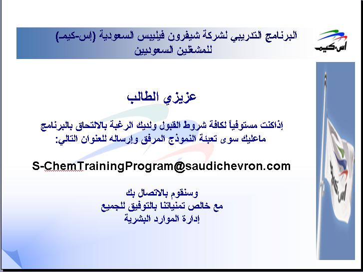 البرنامج التدريبي لشركة شيفرون فيليبس السعودية (إس-كيمـ) للمشغلين السعوديين عزيزي الطالب إذاكنت مستوفياً لكافة شروط القبول ولديك الرغبة بالالتحاق بالبرنامج ماعليك سوى تعبئة النموذج المرفق وإرساله للعنوان التالي: S-ChemTrainingProgram@saudichevron.com وسنقوم بالاتصال بك مع خالص تمنياتنا بالتوفيق للجميع إدارة الموارد البشرية |