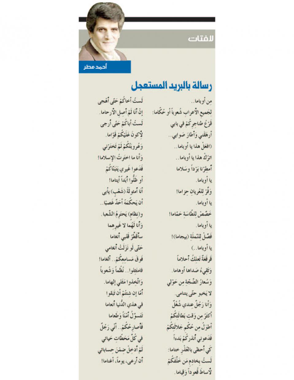بس فعلا قويييية.. لافتة .. للشاعر أحمد مطر .. مِن أوباما.. لِجَميعِ الأعرابِ شُعوباً أو حُكّاما: قَرْعُ طَناجِرِكُمْ في بابي أرهَقَني وَأطارَ صَوابي.. (افعَل هذا يا أوباما.. اترُك هذا يا أوباما أمطِرْنا بَرْداً وسَلاما يا أوباما. وَفِّرْ للِعُريانِ حِزاما! يا أوباما. خَصِّصْ للِطّاسَةِ حَمّاما! يا أوباما. فَصِّلْ للِنَملَةِ بيجاما ! يا أوباما..) قَرقَعَة تَعلِكُ أحلاماً وَتَقيء صَداها أوهَامَا وَسُعارُ الضَّجّةِ مِن حَوْلي لا يَخبو حتّى يتنامى. وَأنا رَجْلُ عِندي شُغْلٌ أكثَرُ مِن وَقتِ بَطالَتكُمْ أطوَلُ مِن حُكْمِ جَلالَتِكُمْ فَدَعوني أُنذركُمْ بَدءاً كَي أحظى بالعُذْر ختاما: لَستُ بِخادمِ مَن خَلَّفَكُمْ لأُسِاطَ قُعوداً وَقياما. لَستُ أخاكُمْ حَتّى أُهْجى إن أنَا لَمْ أصِلِ الأرحاما. لَستُ أباكُمْ حَتّى أُرجى لأكِونَ عَلَيْكُمْ قَوّاما. وَعُروبَتُكُمْ لَمْ تَختَرْني وَأنا ما اختَرتُ الإسلاما! فَدَعوا غَيري يَتَبَنّاكُمْ أو ظَلُّوا أبَداً أيتاما! أنَا أُمثولَةُ شَعْبٍ يأبى أن يَحكُمَهُ أحَدّ غَصبْا.. و نِظامٍ يَحتَرِمُ الشَّعبا. وَأنا لَهُما لا غَيرِهِما سأُقَطِّرُ قَلبي أنغاما حَتّى لَو نَزَلَتْ أنغامي فَوقَ مَسامِعِكُمْ.. ألغاما! فامتَثِلوا.. نُظُماً وَشُعوباً وَاتَّخِذوا مَثَلي إلهاما. أمّا إن شِئتُمْ أن تَبقوا في هذي الدُّنيا أنعاما تَتَسوَّلُ أمْنَاً وَطَعاما فَأُصارِحُكُمْ.. أنّي رَجُلُ في كُلِّ مَحَطّاتِ حَياتي لَمْ أُدخِلْ ضِمْنَ حِساباتي أن أرعى، يوماً، أغناما! |