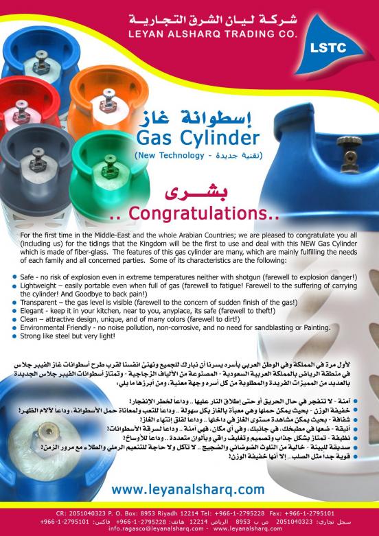 يدخل منتج جديد من اسطوانات الغاز لأسواق المملكة عقب عيد الأضحى المقبل , ومن المقرر أن يكون سعر الاسطوانة الواحدة عند الشراء 350 ريالاً , فيما سيتم استبدالها بأخرى من نفس مواصفاتها لدى محلات الغاز عقب نفاد غازها بالقيمة الحالية لاسطوانات الغاز الصغيرة وهي 15 ريالا . وستكون جميع الأشكال الجديدة من الاسطوانات بحجم واحد «الصغير» . وستكون انطلاقتها من العاصمة الرياض ثم توزيعها في المنطقة الشرقية تمهيدا لتعميمها على بقية المناطق . وخصصت الشركة المنتجة للاسطوانات ومقرها النرويج عددا يتراوح من 400 إلى 500 ألف اسطوانة سنويا للسوق السعودي , ويتم حاليا توزيع هذه الاسطوانات الغازية على 45 دولة في العالم . وسيتم بيع الاسطوانات في السوبر ماركت والمجمعات التجارية والسكنية ومحطات البنزين إضافة إلى نقاط محال الغاز ، كما يجري العمل على تشييد مصنع في المملكة لإنتاج هذا النوع من اسطوانات الغاز بالتعاون من المنتج الرئيسي , ويتوقع تشغيل المصنع في المملكة خلال مدة لا تقل عن 4 اعوام . وتتميز الأسطوانات باستخدام مادة الفيبر جلاس في صناعتها وعدم انفجارها في حال حريق أو عند إطلاق نار إضافة لخفة وزنها وشفافيتها بحيث يمكن التعرف على القدر المتبقي من كمية الغاز ونظافة وانسيابية شكلها . |