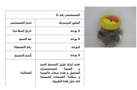 الهيئة العامة للغذاء والدواء في السعودية في إطار الدور الرقابي للهيئة العامة للغذاء والدواء للتحقق من سلامة ومأمونية مستحضرات التجميل ، وبالتعاون مع الجهات المختصة تم الوقوف على مصنع غير مرخص باسم ( مراكب الرفاه للتجارة ) يقوم بتعبئة عدد 18 من مستحضرات التجميل تشمل بعض أنواع الزيوت المستخدمة للشعر ومزيلات العرق والبخور في منطقة سكنية دون إتباع طرق التعبئة والتصنيع الجيد لمستحضرات التجميل والمنصوص عليها في المواصفة القياسية السعودية الصادرة في هذا الشأن ، وقد قامت الهيئة بمخاطبة الجهات المعنية لاتخاذ الإجراءات النظامية اللازمة لسحب هذه المستحضرات الموضحة في الجدول المرفق . وتنصح الهيئة المستهلك بعدم استخدام مستحضرات ( مراكب الرفاه للتجارة ) والموضح أسمائها وصورها على موقع الهيئة والتخلص مما لديهم من عينات ، كما تنصح المستهلك بالتأكد من وجود المعلومات الكافية على منتجات التجميل كاسم المصنع وعنوانه والمحتوى ورقم التشغيلة وتاريخ الإنتاج. وستواصل الهيئة رسالتها التوعية من خلال الإعلان عن أي منتجات مضرة لصحة المستهلك . مراكب الرفاه للتجارة 1 زيت المرمرية للشعر marmariah hair oil 2 زيت لوز مر almond oil 3 زيت خروع body oil 4 زيت جلسرين ( البارفين ) 5 زيت الخس الأصلي 6 البخور الدوسري 7 زيت الجرجير الأصلي 8 زيت خروع أصلي للشعر 9 زيت البصل الأصلي للشعر 10 زيت السدر الاصلي للشعر 11 زيت البابونج الأصلي للشعر والجسم 12 زيت لوز حلو للشعر 13 الزيوت السبعة للشعر 14 زيت الحبة السوداء الأصلي للشعر والجسم 15 زيت خردل أصلي للشعر 16 مزيل العرق ( الرفاه ) 17 زعفران إيراني أبو شيبه ماركة الرفاه 18 زيت النخاع التونسي للشعر المصدر http://www.salamaty.com/news-action-show-id-202.htm |