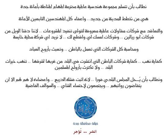 جدة قبل 20 سنة كانت عروس البحر والآن أصبحت عجوزة العروس من يمشى في شوارعها يرى العجب أصابتها التجاعيد من كثر الحفريات والمطبات أصابتها السيلان والزكام من كثرة طفح المياه والصرف الصحي أصابتها الهرم تتزين في الخارج ولكن في الداخل ( البنية ) عفى عليها الزمن أصابتها الجفاف لقلة المياه في أكثر أحيائها أصابتها الخمول والكسل لكثرة المركبات والسيارات والإزدحام |