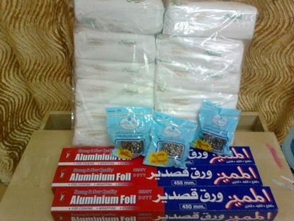 فيه قصدير و رول بلاستيك تغليف الساندويشات .. يجي مها لفات كبيرة .. فيها توفير اكثر.. |