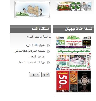 في أسفل صفحة عكاظ الرئيسية (النسخة الإليكترونية) و على يسار القاريء تجدون الإستفتاء التالي عن مقاطعة شركات الألبان: