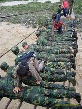 الصورة الاولى : الجيش الياباني يشكل جسر بشري لمرور المواطنين على ظهورهم فوق مياه تسونامي! صورة جميلة