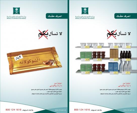 بعد شهر من الآن واعتبارًا من: 1-6-1434هـ وزارة التجارة تطلق حملة "إعرف حقك ولا تسأل بكم" التي توجب على المحلات الالتزام بوضع بطاقة السعر على جميع السلع، وعلى جميع منافذ البيع الالتزام بهذا القرار. وهذا فيديو تعرفي بالحملة: همتكم في نشر الخبر والإبلاغ عن المحلات المخالفة بالإتصال على رقم الشكاوى الخاص بوزارة التجارة: 800-124-1616 |