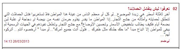بعد ارتفاع أسعار البيض.. محال شبه خالية.. والسعوديون: (خلوها تفقس) العاصمة - محمد القاسم الثلاثاء 25 مارس 2013، آخر تحديث 38:22 محال بيع البيض تبدو شبه خالية من الزبائن أدى ارتفاع سعر طبق البيض في المملكة إلى إنشاء حملة شعبية عبر مواقع التواصل الاجتماعية بعنوان " خلوها تفقس" لحث المواطنين على مقاطعة شراء البيض من المحال التي رفعت أسعار طبق البيض بشكل غير مبرر . (الجزيرة أونلاين) قامت بجولة على بعض محال بيع الدواجن والبيض التي كانت شبه خاليه من الزبائن, فيما بدا العمال واقفين أمام بوابات المحل ينتظرون أي زبون يأتي إليهم . يقول حسين سيد (بائع): "المحال لا ذنب لها والسبب الرئيسي في غلاء طبق البيض هم الموزعون والشركات المنتجة للبيض حيث كان الكرتون قبل أسابيع بـ180 ريال و الآن أصبح بـ190 فاضطررنا لرفع سعر الطبق من 14 ريالاً إلى 16 من أجل التعويض والمكسب . ويؤكد المواطن عادل الجدعاني أن كل شيء ارتفع وليس فقط البيض, "فلو كانت هنالك عقوبات رادعة للتجار الذين رفعوا أسعار السلع سابقاً لما ارتفع البيض الآن ... و أيضاً على وزارة التجارة تطبيق نظام وضع التسعيرة على أطباق البيض لأن التلاعب فيها أصبح واضحاً فهنالك محال تبيع طبق البيض بـ15 ريالا وبعضهم بـ16 ريالاً رغم أنها نفس العدد ونفس الحجم فماذا هذا التفاوت". ويعلل المواطن سامي الدهيم مجيئه إلى محال بيع البيض بمقولة: "مجبر أخاك لا بطل ... البيض أساسي ولا نستطيع مقاطعته, ولكن إذا استمر الشعب في حملته "خلوها تفقس" نحاول التقليل من استخدامه؛ لأن أغلب الحملات الشعبية السابقة لا تستمر طويلاً وبعضها لم يجد نفعاً مثل حملة مقاطعة الدجاج". http://www.al-jazirahonline.com/2013...25/ec35002.htm حطيت لهم التعليق التالي وماكنت متوقع ينشروه.. نشروه لكن حذفوا منه اسم المنتدى. ملف مرفق 5844 |