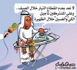 وأشار إلى أن من أهم الأسباب التي تؤدي إلى استخدام الكهرباء بفعالية عالية هي تشغيل الأجهزة عند وقت الحاجة فقط وليس على مدار الساعة وتأجيل أي أحمال في وقت الظهيرة إلى الخامسة عصرا كغسيل وكي الملابس للتخفيف على الشبكة إضافة إلى تصميم المنازل بطريقة مناسبة واستخدام العزل الحراري الذي يوفر على المستهلك أكثر من 40% من فاتورة التكييف والتي تعتبر الثقل الاكبر خاصة في فصل الصيف. لماذا ركز على بيوت المواطنيين والمقيمين ونسى المغاسل الالية التي تعمل دون توقف ليلا ونهارا غسيل وكوي من اجل راحتنا ... وكسل بعض ربات بيوتنا فنجد ان المواطن يدفع للمغاسل اكثر مما يدفعه للكهرباء |