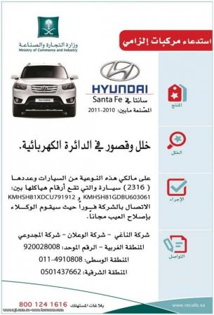 التجارة تستدعي 2316 مركبة من نوع "سانتافي " وتدعو ملاكها بالإتصال فورا بوكلائها منذ ساعة 12:59 PM عاجل(هادي بن لهد)- ألزمت وزارة التجارة والصناعة وكلاء شركة هيونداي بالسعودية بإستدعاء 2316 مركبة من نوع "سانتافي " المصنعة بين عامي 2010 -2011م وذلك لوجود خلل وقصور في الدائرة الكهربائية ملزمتهم بإصلاح هذا الخلل مجانا ، مهيبة من مالكي هذه المركبات الاتصال فورا على وكلائها لاصلاحه . |