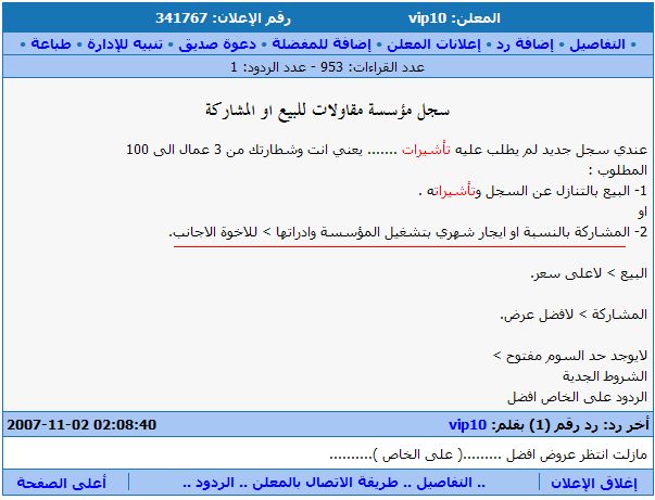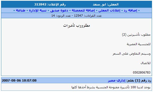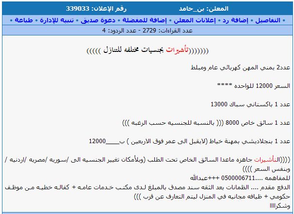 الصور هذه مأخوذة من موقع مستعمل طبعا الموقع هو مجرد وسيط و وسيلة إعلان. و يقدم خدمة ممتازة في مجاله. http://www.mstaml.com ممكن تزوروا الموقع و تبحثوا عن كلمة تأشيرات و راح تقرأوا العجب. و ودي أسأل عن نظامية التنازل عن التأشيرات. إذا كان نظامي فأنا أشوف انه له سلبيات كبيرة. أولا معناها ان العامل إذا خرج يدخل مكانه واحد ثاني. يعني ما راح يقل عدد العمالة الأجنبية. ثانيا تصبح تكلفة تأشيرة العامل الأجنبي صفر. لأنه بعد ما ينتهي عمله, كفيله يبيع التأشيرة بالتنازل فـ كأنه ما دفع شي في التأشيرة. بالعكس ممكن يكسب منها. و هذا يتسبب بمقارنه غير عادلة بين العامل السعودي و الأجنبي. بالإضافة الى التساهل و استقدام العمالة الأجنبية من غير ضرورة حقيقية. و هذه عينة من الموجود. و لاحظوا الإعلان الأول. فيه عرض للتستر. |