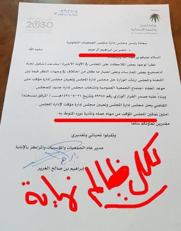 وزير العمل يأمر بحل مجلس إدارة الجمعيات التعاونية الذي كان يرأسه "ناصر التويم"(رئيس جمعية حماية المستهلك السابق): . . . الظاهر الفضائح المالية لن تنتهي مع وجود أسماء بعينها في إدارات أي جهة: . . |