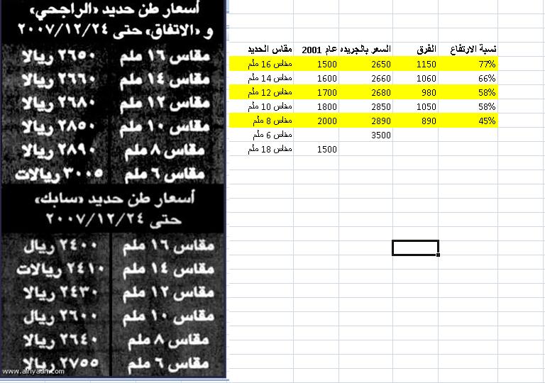 مايلي مقارنه بين الاسعار عام 2001 والاسعار بالجريده علمآ بان الحديد ابوكسي (مطلي) الذي يتجاوز سعره الغير مطلي الطول 12 م: |