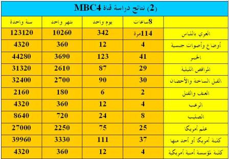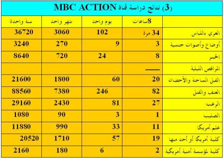 دراسة تحليلية لقنوات الـ MBC تعتبر مجموعة قنوات الـ MBC من أقوى القنوات في الفضاء الإسلامي والعربي ومن أقدمها عمراً ، لذا نرى تزايد عدد جمهورها وتفوقها على القنوات الأخرى في خبرتها الإعلامية والمهنية، وهي مع هذا التقدم الحرفي والفني أثارت ضجة واسعة حول أهدافها وطريقة تعددها وانتشارها، وكثير من هذه الآراء تعد انطباعاً عند مشاهدة عابرة ولم تبنَ على دراسة علمية واقعية، وفي هذه الدراسة أردت أن أتعرف على حقيقة هذه القنوات بأسلوب علمي وموضوعي. ففي يوم السبت 29 جمادى الآخرة عام 1428هـ الموافق 13 يوليو عام 2007م بدأت أسجل القنوات محل الدراسة لأحلل مضمونها وأدرس محتواها، فأسأل الله الإخلاص والتوفيق والعون في هذه الدراسة. نشأة تلفزيون الشرق الأوسط MBC بدأ مركز تلفزيون الشرق الأوسط MBC بث إرساله من لندن في 18 سبتمر 1991م كأول قناة عربية مستقلة مملوكة من قبل القطاع الخاص بين المحطات التلفزيونية العربية التي تبث إرسالها عبر الأقمار الصناعية ، وكان رأس مال مركز تلفزيون الشرق الأوسط عند إنشائه قرابة 300 مليون دولار، وميزانيته السنوية قرابة 60 مليون دولار. وتعد مجموعة "آرا" الدولية التي تمتلك –أيضاً- وكالة أنباء يونايتدبرس، وراديو " يبكتروم" من لندن الذي يبث باللغة العربية، وراديو " MBC FM" الموجه للجزيرة العربية، وشركة آرا للكيبل التلفزيوني؛ الشركة الأم للمركز، حيث بدأت هذه المجموعة كمركز إعلامي سعودي متخصص في الإنتاج التلفزيوني، ثم تولت التخطيط والدراسة الأولية للقناة التي استغرقت تجاربها الفنية التجريبية حوالي ثلاث سنوات، وقد كانت مجموعة "آرا" هي التي أبرمت اتفاقاً في لندن مع الشركة الأمريكية " يونايتد انترناشونال هولندج" المتخصصة في توزيع الكابل في العالم لتنفيذ خدمات الكابل في الشرق الأوسط ولتأمين وصول إشارات التلفزيون إلى كل بيت في المنطقة الشاسعة بالسعودية. ويوضح الجدول التالي توزيع ملكية مركز الشرق الأوسط على الشركات والهيئات الخاصة مجموعة تلفزيون الشرق الأوسط MBC: استطاعت مجموعة تلفزيون الشرق الأوسط MBC أن تجذب عدداً كبيراً من مشاهدي منطقة العالم الإسلامي والعربي لأسبقيتها وخبرتها وتعاقدها مع كبار الشركات المنتجة العربية والأجنبية، بالإضافة إلى حرصها على التشويق والإثارة دون اعتبار لمسلَّمات المجتمع المسلم، فلذا استقطبت كثيراً من الشباب والفتيات لإشباع رغبة كامنة في نفوسهم. تضم مجموعة mbc اليوم ست قنوات تلفزيونية هـي: mbc1 ، و mbc2 ، و mbc3 ، و mbc4 ، و MBCAction ، ومحطتـين إذاعيتين هما: mbcFM (للموسيقى الخليجية)، وبانوراما fm (للأغاني العربية الحديثة) ؛ بالإضافة إلى شركة O3 للإنتاج (وحدة الإنتاج المتخصّصة بالبرامج والأفلام الوثائقية)، وشركة "أخبار الشرق الأوسط" MEN (وكالة جمع الأخبار). كما تنبثـق عن المجموعة عدة مواقع إلكترونية رائدة على شبكة الإنترنت تتضمن: www.mbc.net ، و www.alarabiya.net، و www.alaswaq.net . فقد بدأ بث قناة MBC1 مع بدية انطلاق هذه المحطة بتاريخ 18 سبتمبر 1991م بعد انتهاء حرب تحرير الكويت وانتصار القوات المشتركة بقيادة أمريكا، وهي القناة الوحيدة من قنوات MBC عربية الأصل، فهي تبث أفلام ومسلسلات وبرامج للفنانين والممثلين العرب. في عام 1994، أطلقت المحطة الإذاعية MBC FM التي تقدمت عالماً من الموسيقى الخليجية والعربية. وفي عام 2002، انتقل مقر مركز تلفزيون الشرق الأوسط إلى دبي، الإمارات العربية المتحدة، وبالتحديد في مدينة دبي للإعلام. وعملت على توسيع نشاطاتها وتدشين محطات جديدة متخصصة في أمور معينة. في عام 2003 تم إطلاق MBC 2 التي كانت ولا تزال متخصصة في عام السينما والأفلام الأجنبية، وخصوصاً الأمريكية منها. وهي تعد الآن إحدى أشهر المحطات المجانية المتخصصة في ذلك. وفي نفس العام وتحديداً في 3 مارس 2003، أطلقت قناة العربية الفضائية وهي محطة إخبارية ، وتبث على مدار الساعة. بالإضافة إلى نشرات الأخبار، تعرض البرامج التحليلية واللقاءات مع كبار الشخصيات السياسية وغير السياسية، وكذلك البرامج الوثائقية. وقد ظهرت بعد من