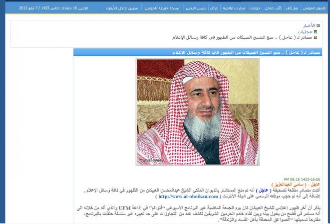 أنه تم منع المستشار بالديوان الملكي الشيخ عبدالمحسن العبيكان من الظهور في كافة وسائل الإعلام , إضافة إلى أنه تم حجب موقعه الرسمي على شبكة الأنترنت (