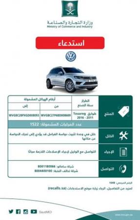 "التجارة" تستدعي 1522 سيارة "فولكس واجن" بسبب خلل بدواسة الفرامل
