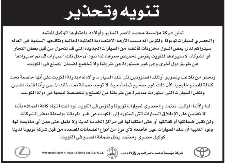 يحذر عبر إعلان في جريدة الأنباء الكويتية