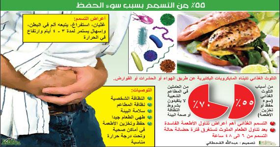 وفي سياق متصل، أوضحت الدكتورة رويدا إدريس، أن التسمم الغذائي يعرف عادة بأنه حالة مرضية مفاجئة تظهر أعراضها خلال فترة زمنية قصيرة على شخص أو عدة أشخاص بعد تناولهم غذاء غير سليم صحيا، حيث تظهر أعراض التسمم الغذائي على هيئة غثيان قيء، اسهال، تقلصات في المعدة والأمعاء، وتختلف أعراض الإصابة وارتفاع الحرارة وشدتها والفترة الزمنية اللازمة لظهور الأعراض المرضية حسب مسببات التسمم، وكمية الغذاء التي تناولها الإنسان.