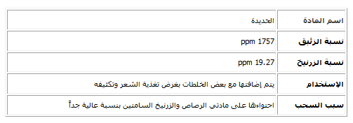 في إطار الدور الرقابي للهيئة العامة للغذاء والدواء لمتابعة ومراقبة سلامة ومأمونية الأدوية والمستحضرات العشبية والصحية ومستحضرات التجميل، فقد قامت الهيئة بسحب عدة عينات من مادة تسمى (الحديدة) يتم إضافتها مع بعض الخلطات بغرض تغذية الشعر وتكثيفه والتي تباع لدى محلات العطارة، وتم إخضاعها للتحليل، وقد أظهرت نتائج التحليل احتواءها على نسب عالية من مادتي الرصاص والزرنيخ السامتين بنسبة عالية جداً أعلى من الحد المسموح به عالمياً (مرفق صورة المادة)، ونظراً لخطورة هذه المادة على الصحة والتي من المعروف أنها عناصر تراكمية تترسب داخل الكبد والكلى والمخ مؤثرة بذلك على الجهاز العصبي وعلى صحة الإنسان.