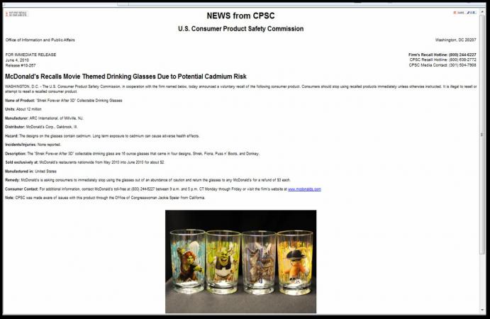 5. لنأخذ مثال (انظر الصورة) لمنتج كاسات وزع مجانا مع وجبات الأطفال لشركة مكدونالدز في السوق الأمريكية، حيث تم التبليغ عنه وسحبه نتيجة احتواء الرسوم على مادة الكادميم والتي قد تسبب أضرار صحية لمستخدميها..