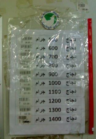 أخذت دجاجة مكتوب عليها 1100 و طلبت من المسؤول عن قسم اللحوم وزنها .. وضعها على الميزان الذي أعطاني أن الوزن الفعلي أكثر من 1230 جرام.