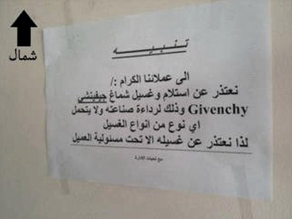 التحذير ينبه العملاء لرفض المغسلة إستلام أشمغة جيفينشي بسبب رداءة صناعتها و تلفها مع الغسيل.