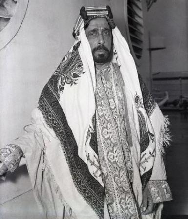 صورة لأميرالأحوازغزعل الكعبي على اليمين الملك عبدالعزيزبن عبدالرحمن