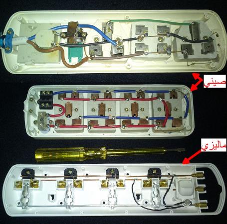 نلاحظ أن طريقة التوصيل واللحام شبه عشوائية في النوع الصيني بينما النوع الماليزي شغله مرتب و نظيف وسماكة معدن الفيش نفسه في النوع الصيني رقيقة قد لاتتحمل تشغيل أجهزة كمكواة كهربائية بينما النوع الماليزي سماكة أفياشه عالية ليعطي درجة تحمل أكبر.