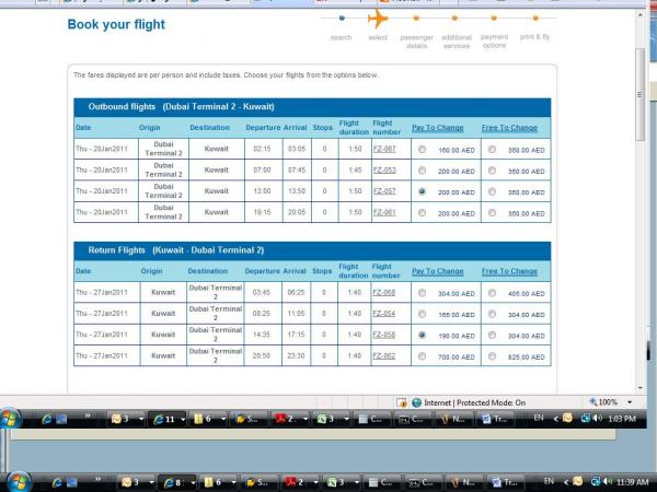 في المرفق ستجد الفرق الشاسع بين تذكرة فلاي دبي وخطوط الامارات لنفس التاريخ 20 يناير ولنفس الوجهة ( الكويت )، فسعر فلاي دبي 390 درهم اذا لم تكن تريد تغيير الرحلة ومع امكانية التغيير يصبح سعرها 600 درهم فقط اضغط على الصورة لعرض أكبر