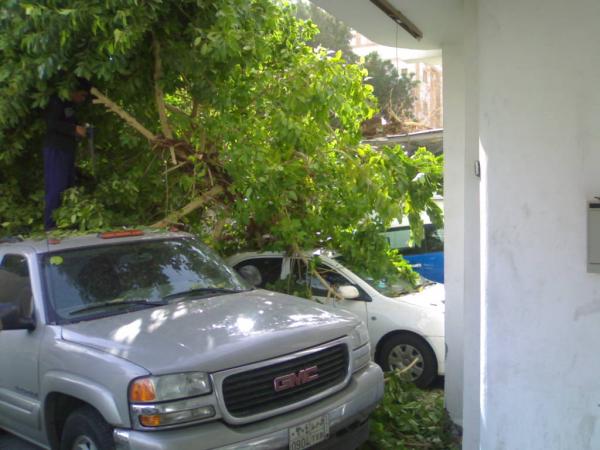 و هذا جارنا (الله يعينه و يعوضهم خير) .. طاحت الشجرة على سياراتهم .. و ترى فيه سيارة صغيرة في النص حقت جار ثاني .. مهي ظاهرة في الصورة: