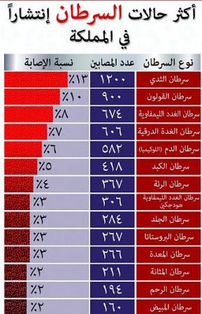 - الجمعية السعودية للسرطان: في عام 2013م سجلت إصابة 13000 سعودي وسعودية بالسرطان.