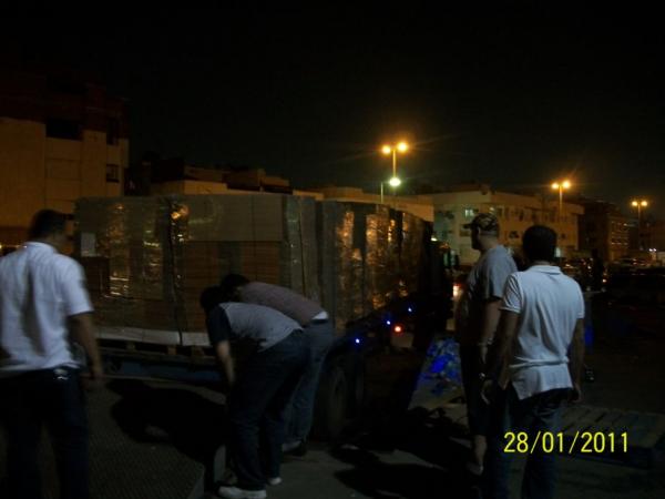 هنا تريللا محملة ببالات كراتين فارغة لترتيب التبرعات و تنظيمها:
