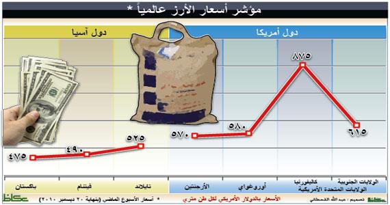 عاودت أسعار الأرز للارتفاع بنسبة 10 في المائة خلال الأيام الماضية، رغم الانخفاضات الذي يشهدها الأرز عالميا، الأمر الذي دفع عدد من الاقتصاديين المتخصصين في مجال تسويق الأرز لدعوة وزارة التجارة والصناعة لتنفيذ جولات ميدانية للتأكد من هذه الارتفاعات وضبطها.