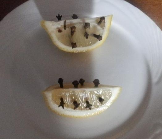 مجرد ليمونة مقطعة أرباع ومغروس فيها بضع حبات مسمار (قرنفل) .. كما في الصورة أدناه: