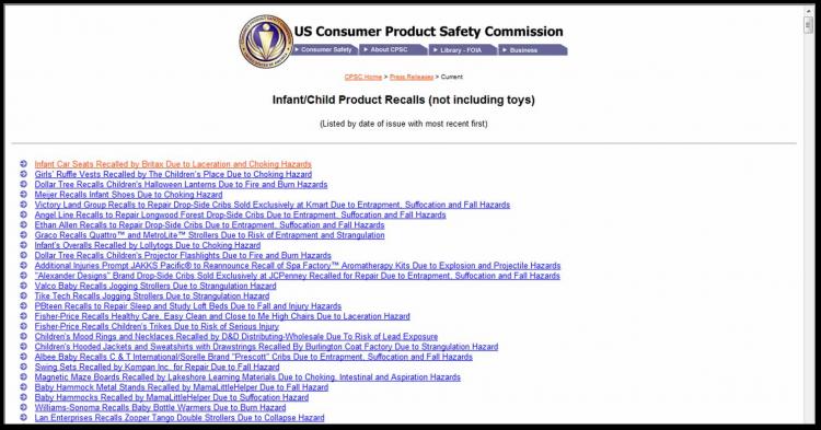 4. لنفرض اخترنا أيقونة منتجات الأطفال (Child Products) ستظهر لك صفحة جديدة تحوي كافة منتجات الأطفال المعلن عنها، اختر من القائمة أحد المنتجات وستظهر لك معلومات كاملة عن المنتج بإسمه وأسم الشركة المصنعة ونوعية الخطورة في المنتج، والإجراء الذي تم اتخاذه.. عذرا فكل ذلك باللغة الإنجليزية!!. على كل ستتغير محتويات الصفحة وفقا للتحديثات.