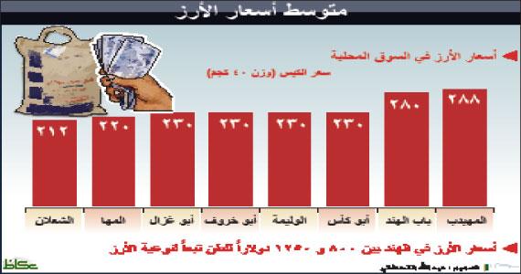 من جانبه أكد عبد العزيز المحروس (مورد) زيادة أسعار الأرز في الهند، مشيرا إلى أن الارتفاعات وصلت إلى 15 في المائة في غضون شهر ونصف تقريبا، موضحا، أن الزيادة لم تحدث دفعة واحدة بل جاءت بشكل تدريجي، إذ سجلت في البداية 3 في المائة و بعدها 5 في المائة حتى وصلت إلى 15 في المائة، مبينا، أن الأسعار تتراوح حاليا بين 800 و 1250 دولارا للطن تبعا لنوعية الأرز.