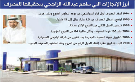 بعد 30 عاماً من العطاء في الدائرة التنفيذية القيادية لأحد أهم المصارف السعودية، أعلن مصرف الراجحي أمس الأول قبول استقالة عبدالله بن سليمان الراجحي الرئيس التنفيذي وعراب المراحل التطويرية الأكثر أهمية في تاريخ المصرف، لحاجته التفرغ لإدارة أعماله الخاصة، الرجل الهادئ جداً كما يصفه المقربون منه كان أيقونة مهمة في المصرف، عند استقراء المشروعات على الورق وقبل تنفيذها، إذ إنه يجيد قراءة ما بين السطور، هذه الميزة أكسبته نجاحاً باهراً في المشروعات التمويلية التي يقرها أو يمتنع عنها قبل الشروع في تنفيذها مع الآخرين.