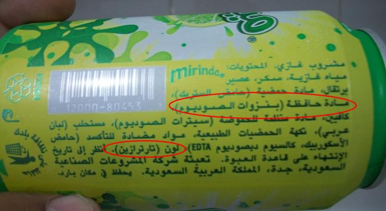 أول شيء عندنا ميرندا حمضيات .. نجد فيه بنزوات الصوديوم و لون أصفر تارترازين.