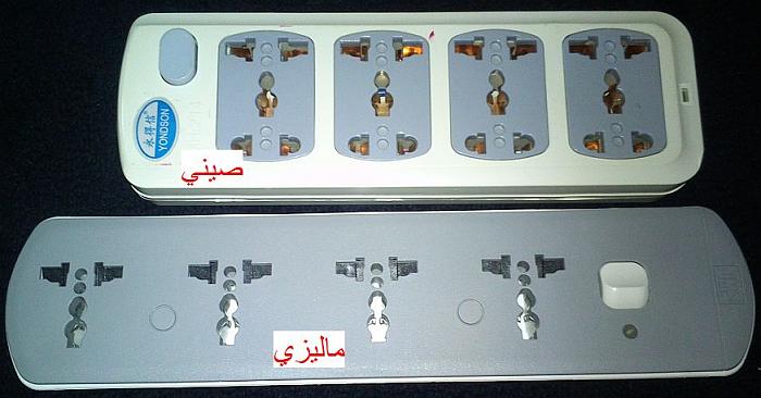 نلاحظ أن طريقة التوصيل واللحام شبه عشوائية في النوع الصيني بينما النوع الماليزي شغله مرتب و نظيف وسماكة معدن الفيش نفسه في النوع الصيني رقيقة قد لاتتحمل تشغيل أجهزة كمكواة كهربائية بينما النوع الماليزي سماكة أفياشه عالية ليعطي درجة تحمل أكبر.