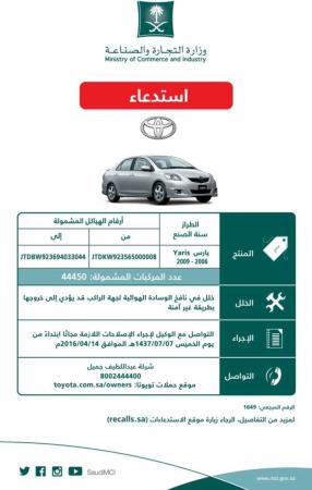 "التجارة" تستدعي 44 ألف سيارة "تويوتا/ يارس" لخلل فني